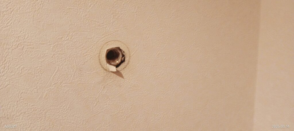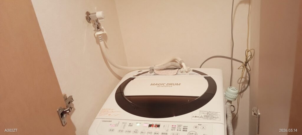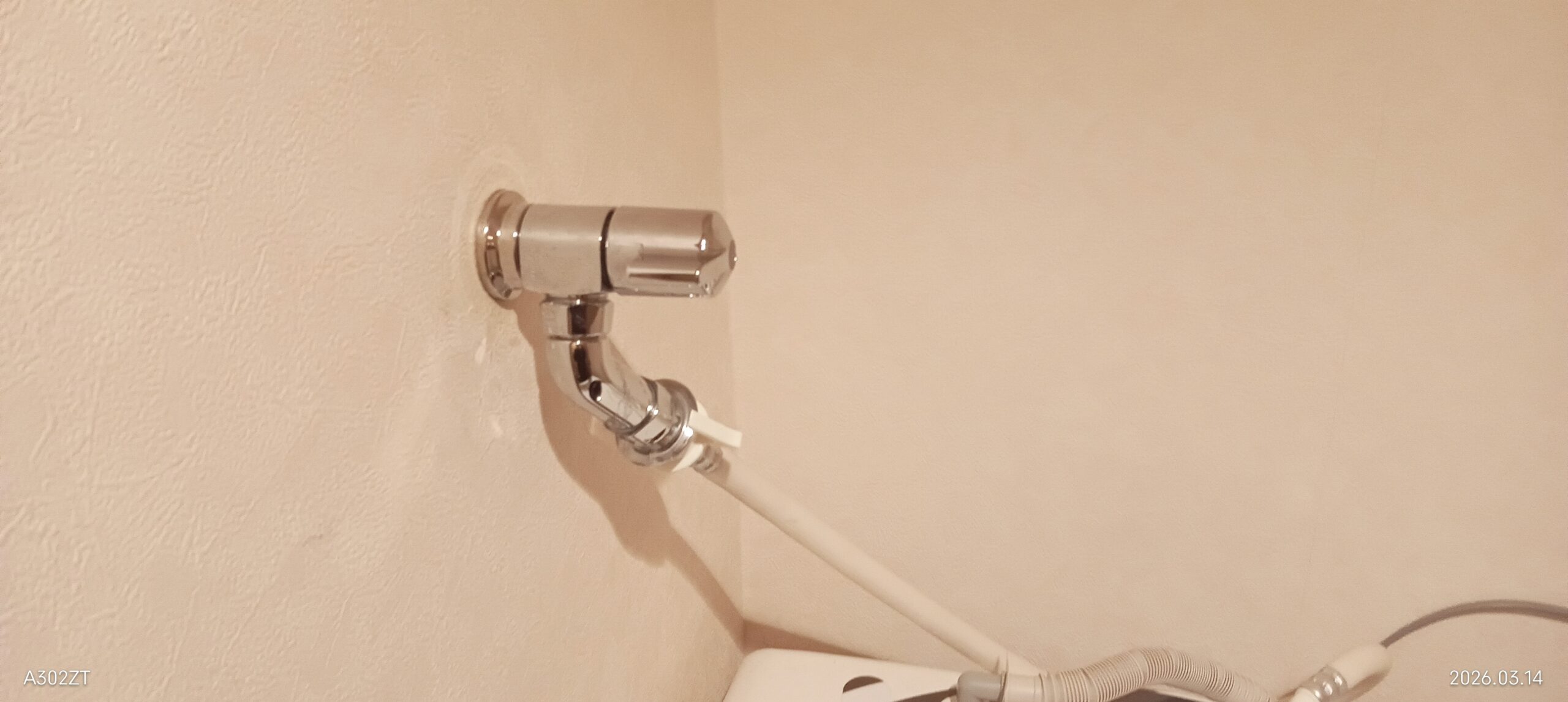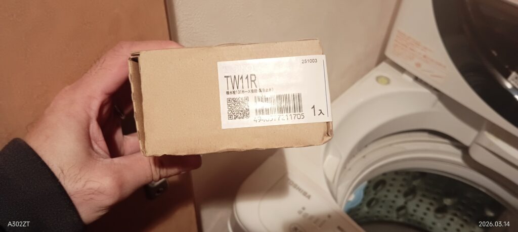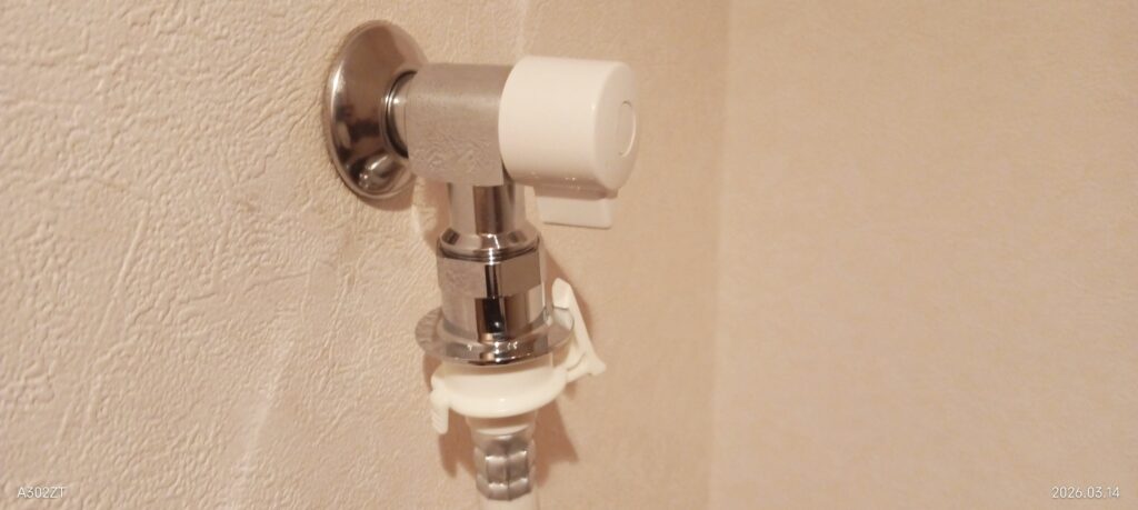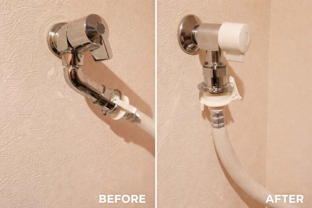 既存の単水栓を撤去し、TOTO製洗濯機用横水栓(TW11R)に交換。ホース接続と緊急止水機能も付いているので、万が一ホースが外れても水が止まる安心設計です。